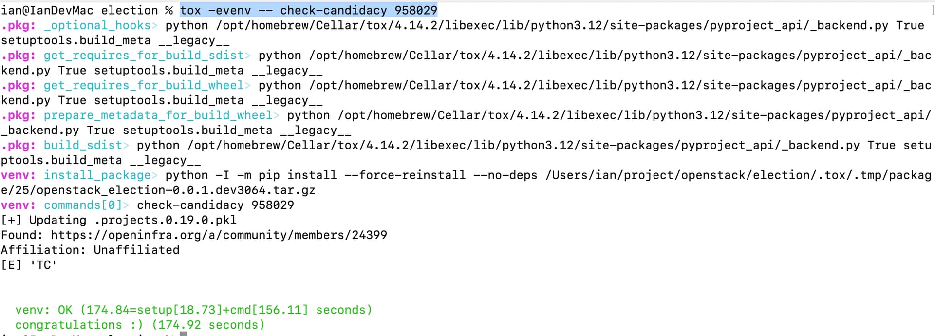 그리고 두 번째는, 때로는 툴에 오류가 있을 수도 있다는 것입니다. 선관위 툴이 오픈 소스로 되어 있다는 것은 그만큼 기반 오픈 소스 라이브러리들에 의존성이 있다는 의미가 되고요, 때로는 이 오픈 소스 라이브러리에서 생성되는 버그로 인해 툴을 제대로 사용하지 못하는 경우가 발생할 수도 있습니다. 특히, 이번 선거 기간에는 입후보자에 대한 IRC 닉네임이 보이지 않던 이슈가 있었는데요, 알고보니 Foundation 멤버를 검증하는 API에서 반환을 하지 않고 있었습니다. 이러한 원인 파악을 위해서는 사용하는 오픈 소스 툴에 대한 디버깅도 필요하게 되죠.