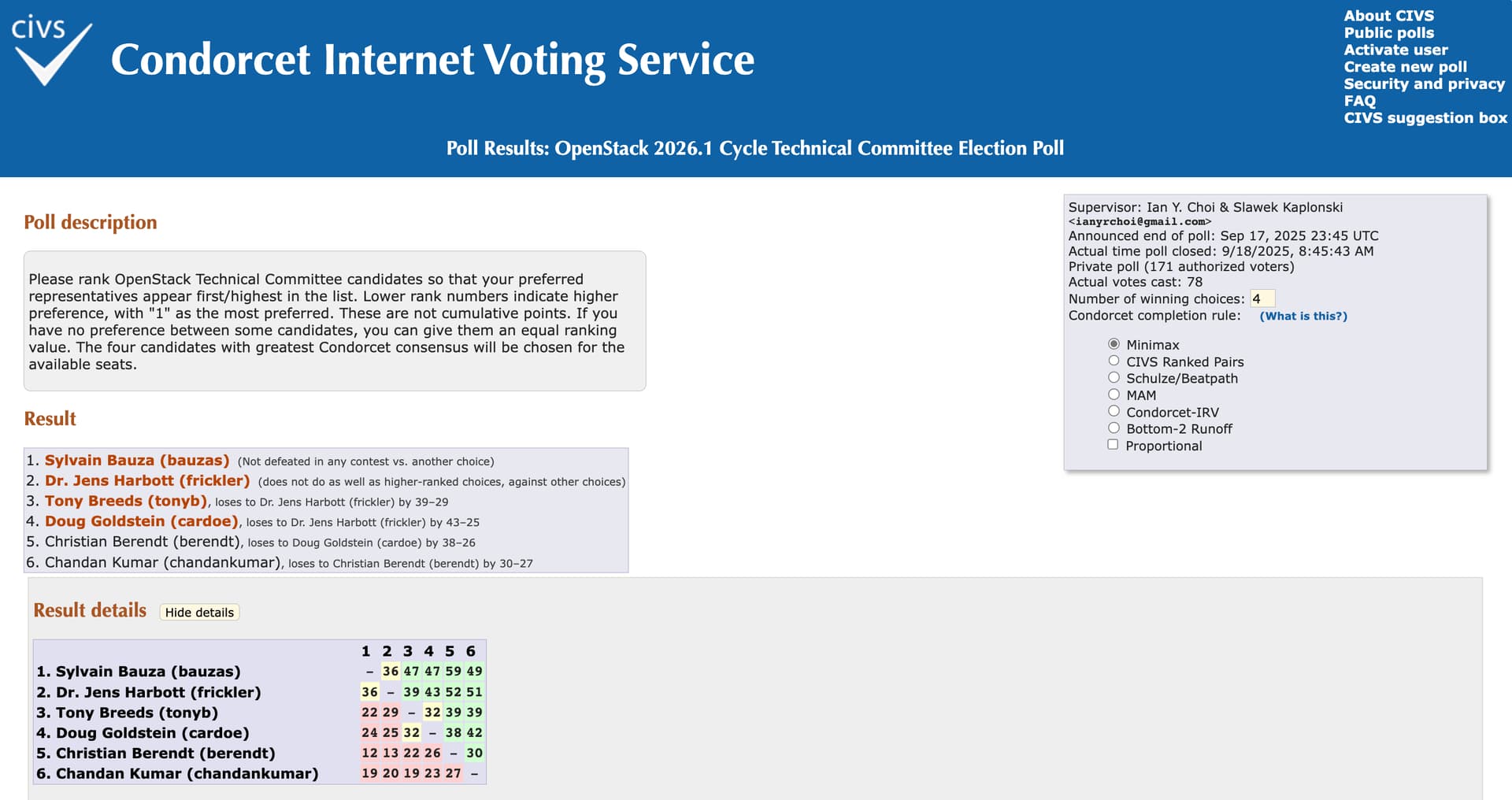 이번 달과 지난 달에는 다음 릴리스인 Gazpacho (2026.1)에서 활동할 프로젝트 팀 리드인 PTL (Project Team Lead), 그리고 다다음 릴리스인 2026.2 (H로 시작, 이름 미정)까지 활동할 기술 위원회 (Technical Committee) 후보를 선출하는 오픈스택 선거 활동이 있었고, 이번 주에야 선관위로서 공식 활동을 종료하였습니다.