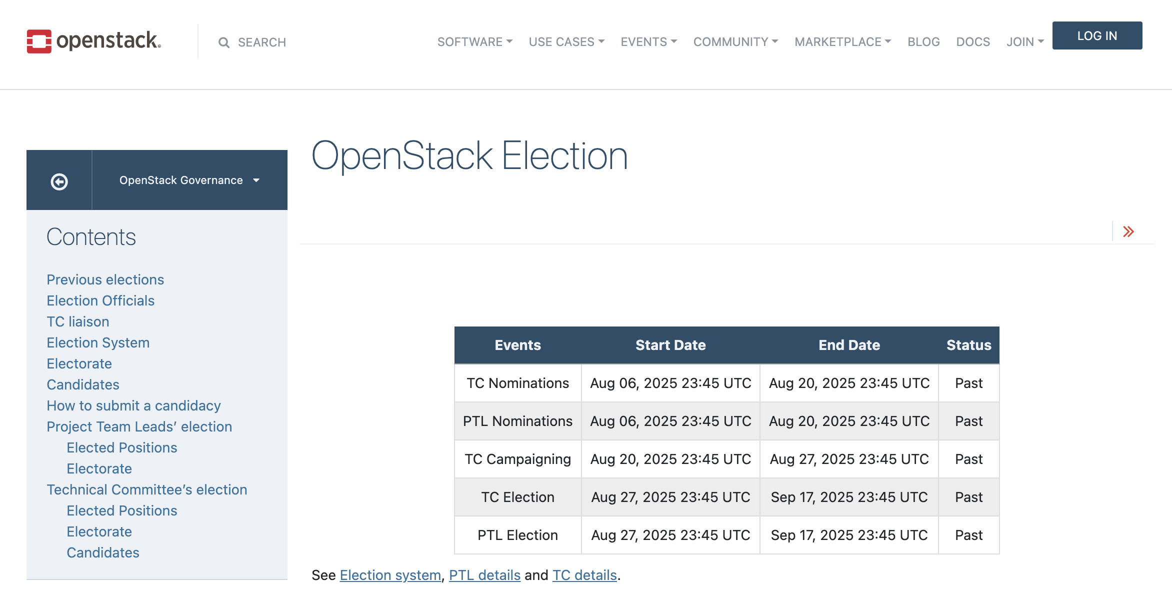 이를 지원하기 위해서는 git 리포지터리가 있어야겠죠. 이 리포지터리 위치는 openstack/election: OpenStack Elections repository - election - OpenDev: Free Software Needs Free Tools 에 있으며, 해당 리포지터리에 있는 문서를 통해 빌드된 사이트가 OpenStack Election — OpenStack Governance 입니다.