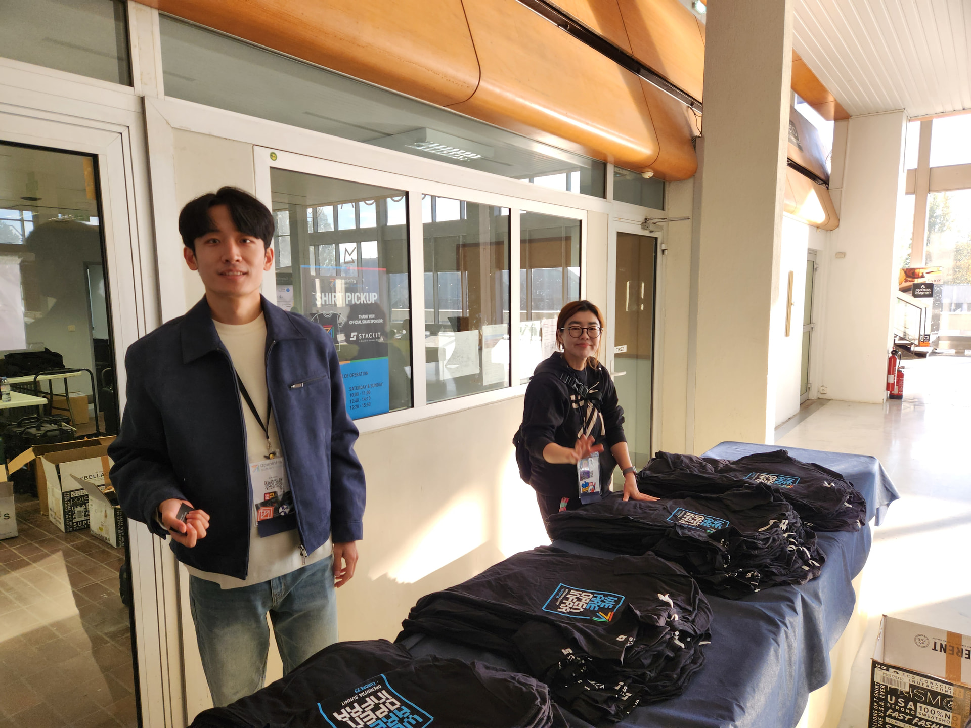 역시 둘째 날 서밋도 자원봉사 모드로 문을 열었습니다. 저와 범석님은 서밋의 꽃, 서밋 티셔츠를 나눠 주었습니다. 올해 디자인 참 예쁘죠?