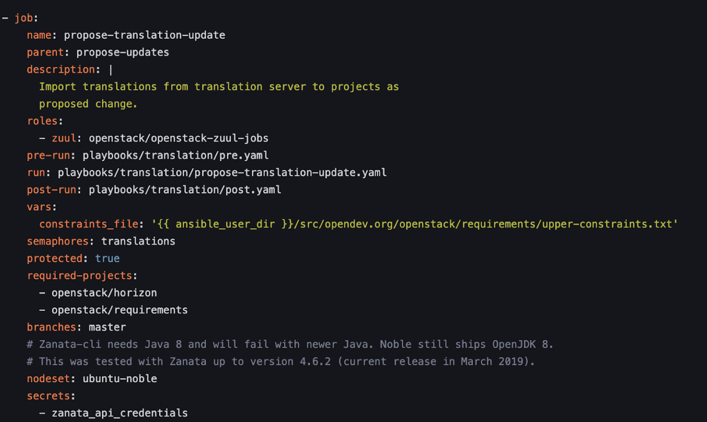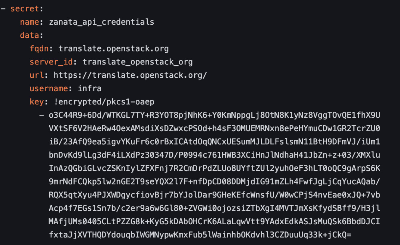 기존 Zanata 기반 번역 워크플로우에서는 인증 정보를 zanata.ini 템플릿 파일을 통해 전달하는 구조이다. Zuul에서 Secret을 복호화한 다음 환경변수 형태로 전달되는 게 아니라, **Ansible 템플릿 시스템(Jinja2)**을 이용해 zanata.ini 설정 파일을 동적으로 생성하고, 그 파일이 실제 Zanata CLI의 인증 설정으로 사용되는 것이다.