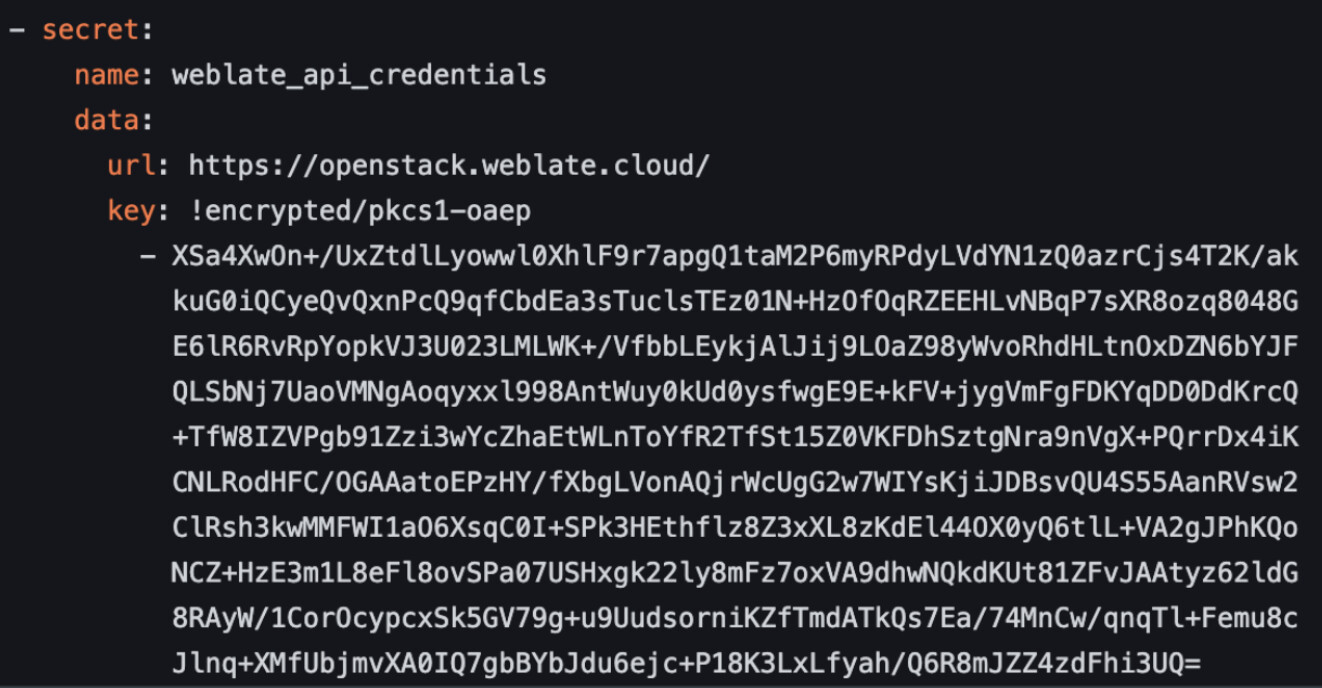 Secret은 YAML 파일 내에서 정의되며, 민감한 데이터를 포함한 키-값 쌍으로 구성된다. 하지만 평문으로 저장되지는 않는다. Zuul은 Secret 파일을 커밋할 때 자동으로 **공개키 기반 암호화(PKCS#1 OAEP)**를 적용하며, 이때 사용되는 공개키는 Zuul이 각 테넌트별로 자체적으로 관리한다.