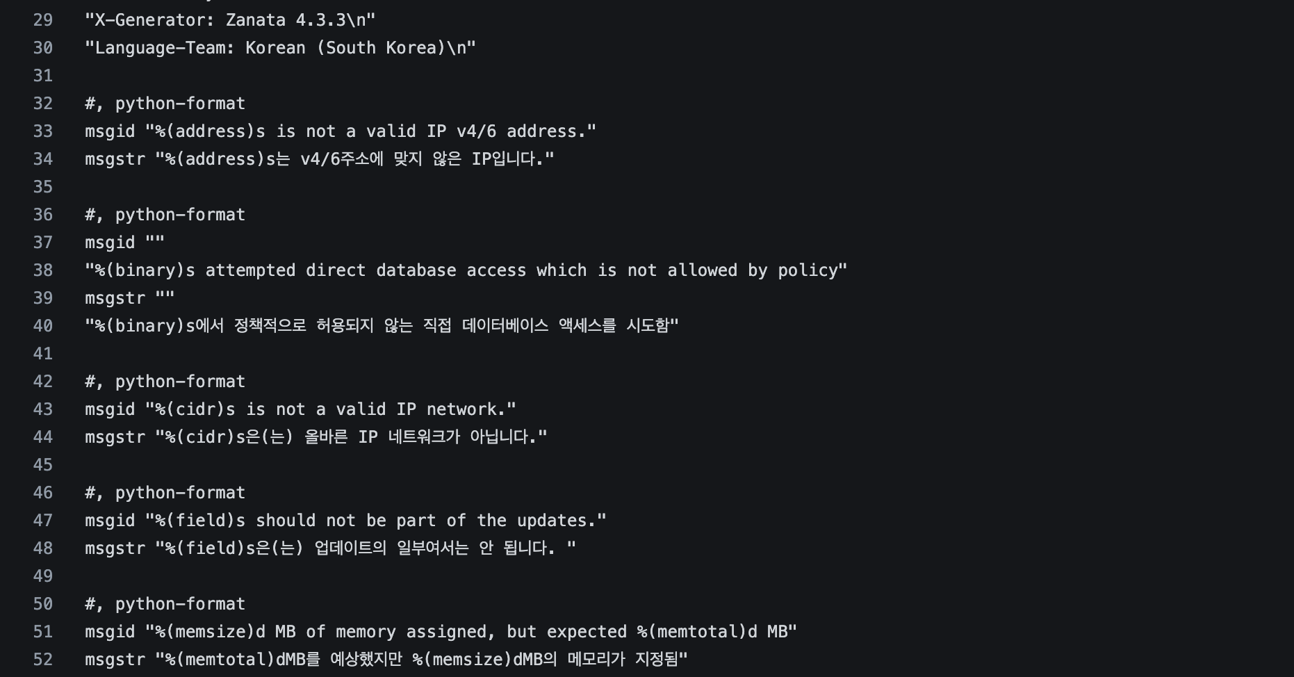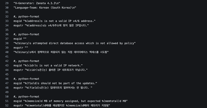 django.po 처럼 gettext 기반이 아니라 JSON 기반 key–value 구조의 번역 파일이다.