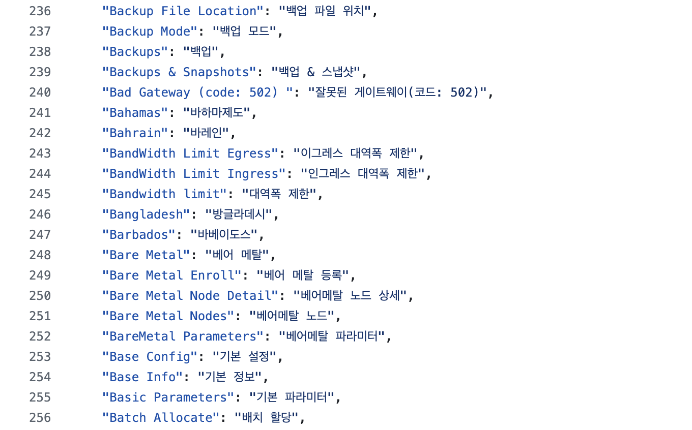 예를 들어 locales/ko-kr.json 파일 안에는 다음과 같은 구조가 있다.