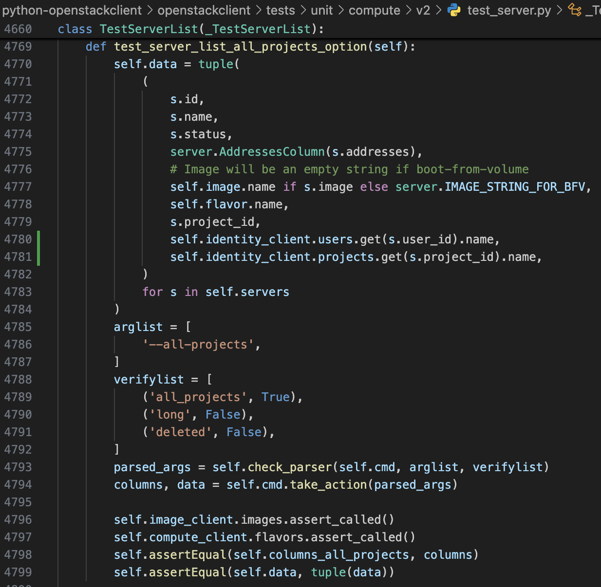 따라서 테스트 코드에서도 server list —all-projects와 관련된 부분에 수정을 적용합니다.