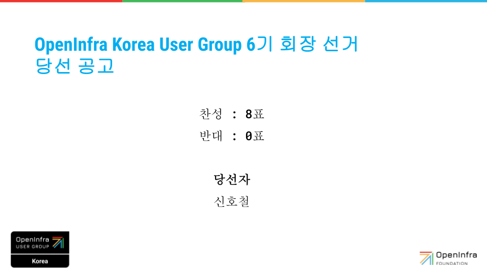 아울러, 지난 4기,5기 대표로서 OpenInfra 한국 사용자 모임의 발전과 활성화를 위해 헌신과 노고를 아끼지 않으신 조성수님께 깊은 감사의 말씀을 드립니다.